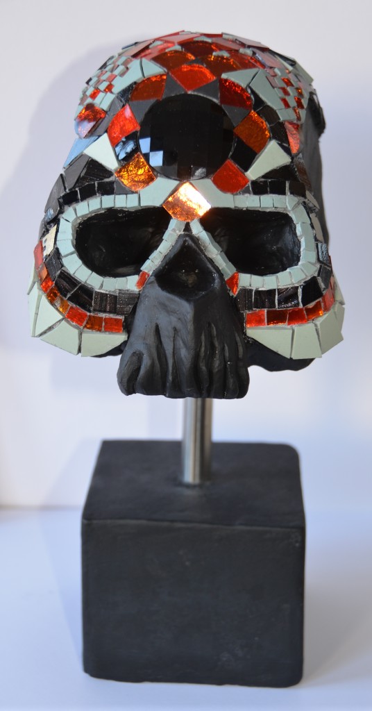 Crâne sculpté dans de la terre d'argile recouvert de mosaïque: