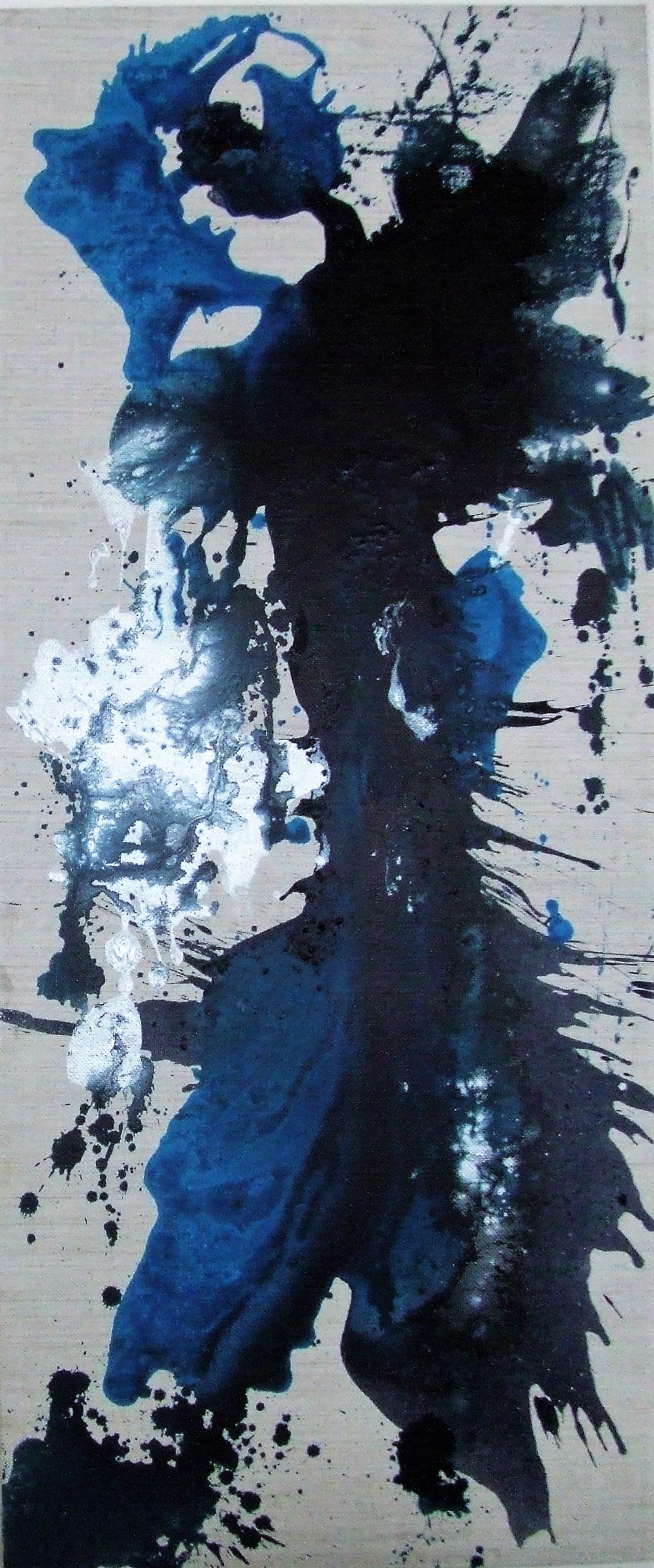 After careful preparation of colors , paint was thrown at random onto the canvas . The end result is always arbitrary but looking closely at the painting, imagination can work its way and I can imagine water rushing down the mountain ... I really can! Can you?