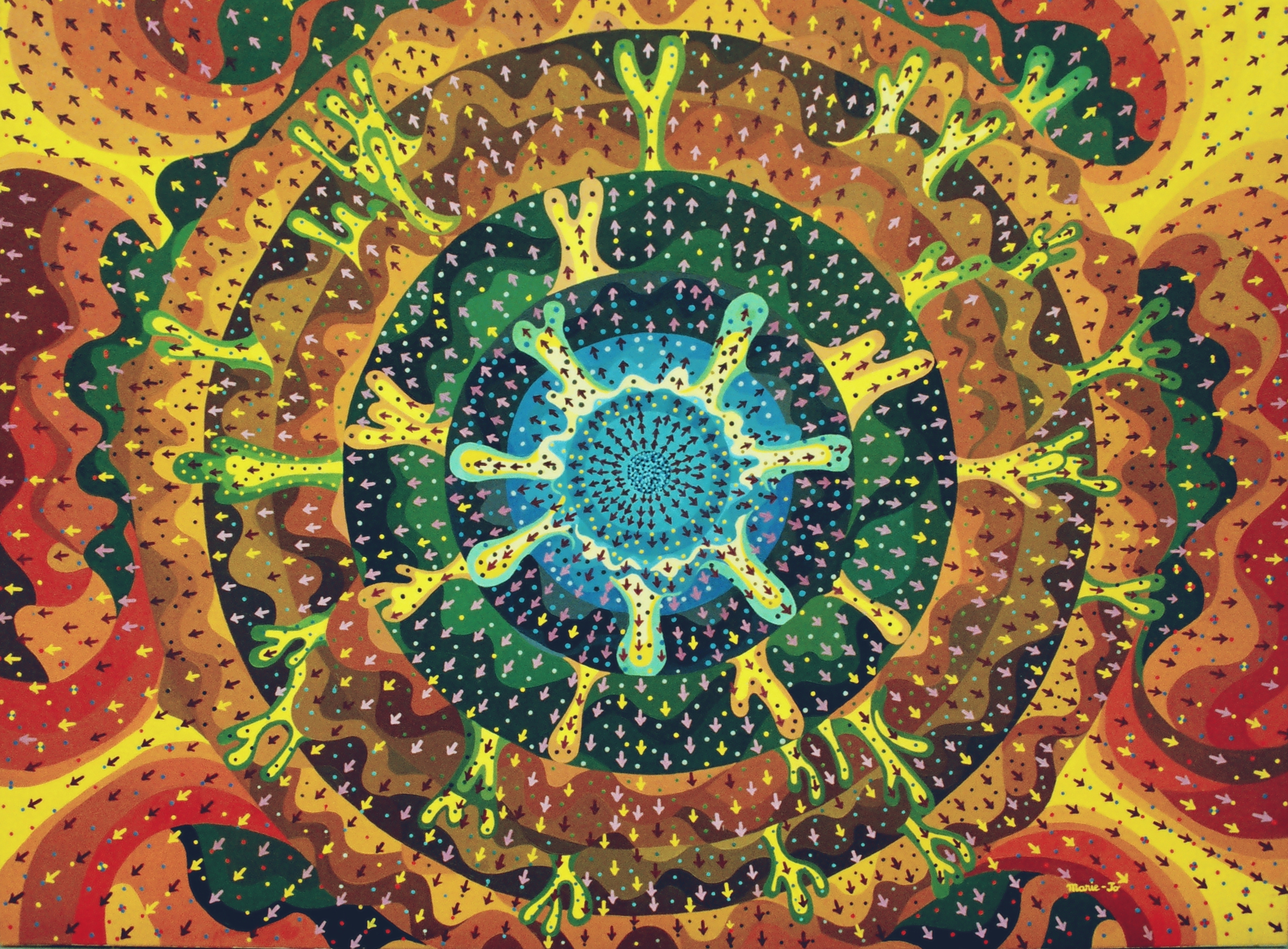 Après "Coeur de Supernovae", cette oeuvre "la vague"représente la suite de l'histoire : au centre de l'oeuvre en bleu figure l'étoile à neutrons d'une extraordinaire densité. L'énergie des neutrinos propulse les couches successives de l'étoile vers l'espace : les couches de nickel cobalt et fer sont d'abord touchées, puis c'est au tour des couches d'oxygène néon carbone d'être frappées quelques secondes plus tard.