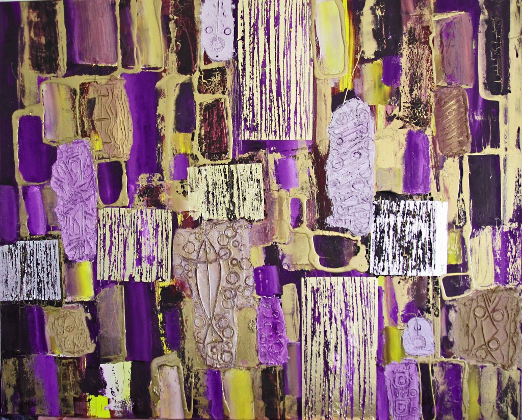 Huile sur toile et technique mixte : acrylique, pâte à modeler durcissante, collage feuilles dorées et argentées.