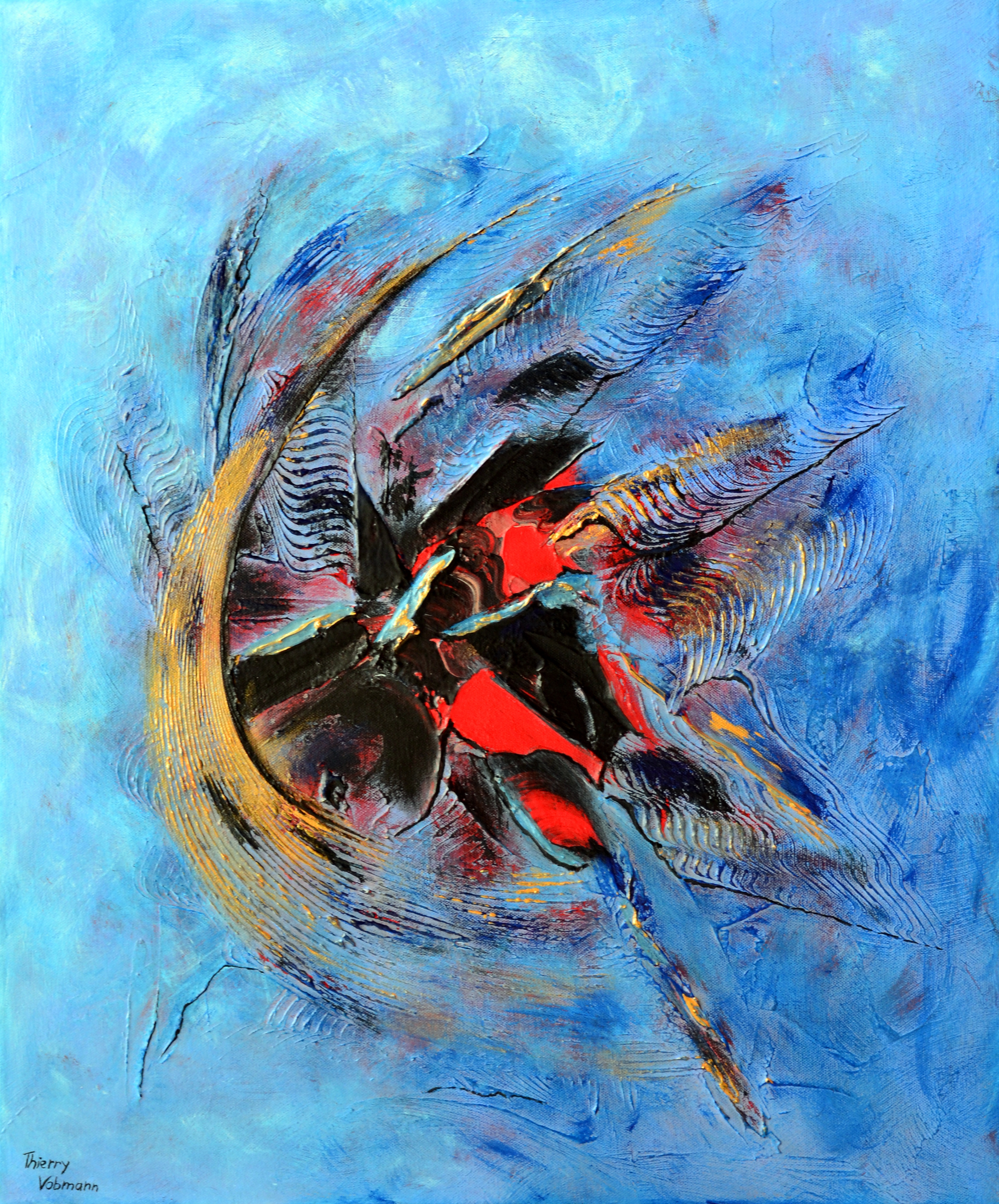 In tai chi technics, the golden breath is the breath wich push bad energies out of your body. In this art work the black and bad energy is blowed out by the movement of the golden blow.