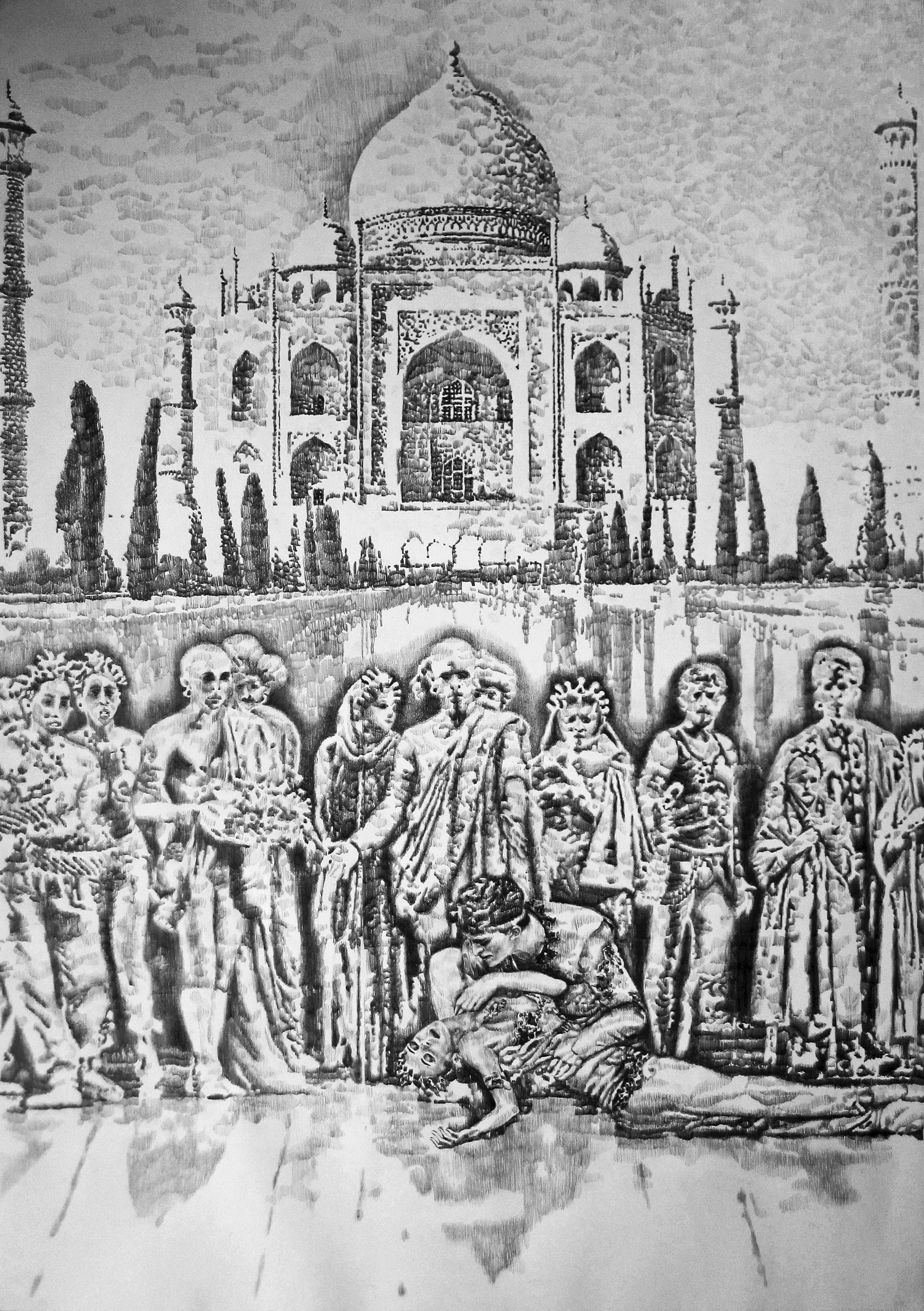 Ballet La Bayadère - Série grands dessins format grand aigle : Dessin 1- Tragédie de la Bayadère au Taj Mahal. Crayon sur Papier dessin– Dimensions : 115 cm – 75 cm. Recontextualisation des éléments chorégraphiques a des moments différents du Ballet la Bayadère. A l’extérieur ou à l’intérieur d’un palais de Maharaja, la danse quitte la scène du théâtre quelque peu et installe un moment scénique tragique dans d’autres lieux. Chaque dessin est une nouvelle histoire, une nouvelle intrigue, c’est une nouvelle annotation chorégraphique et spatiale. L’intensité dramatique de cette mise en scène est accentuée par la dichotomie ombre/lumière tandis que les éléments architecturaux