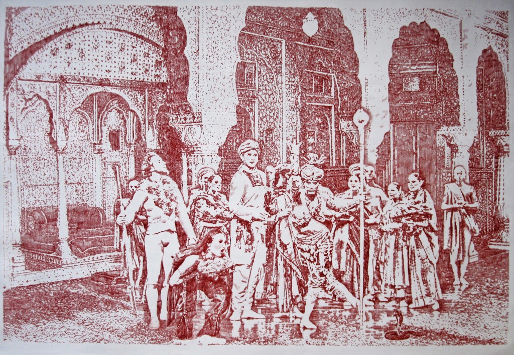 Ballet La bayadère - Série grands dessins format grand aigle : Dessin 3 - Trahison de Solor au serpent. Crayon sanguine sur papier Ingres – Dimensions : 70 cm – 100 cm. Recontextualisation des éléments chorégraphiques a des moments différents du Ballet la Bayadère. A l’extérieur ou à l’intérieur d’un palais de Maharaja, la danse quitte la scène du théâtre quelque peu et installe un moment scénique tragique dans d’autres lieux. Chaque dessin est une nouvelle histoire, une nouvelle intrigue, c’est une nouvelle annotation chorégraphique et spatiale. L’intensité dramatique de cette mise en scène est accentuée par la dichotomie ombre/lumière tandis que les éléments architecturaux