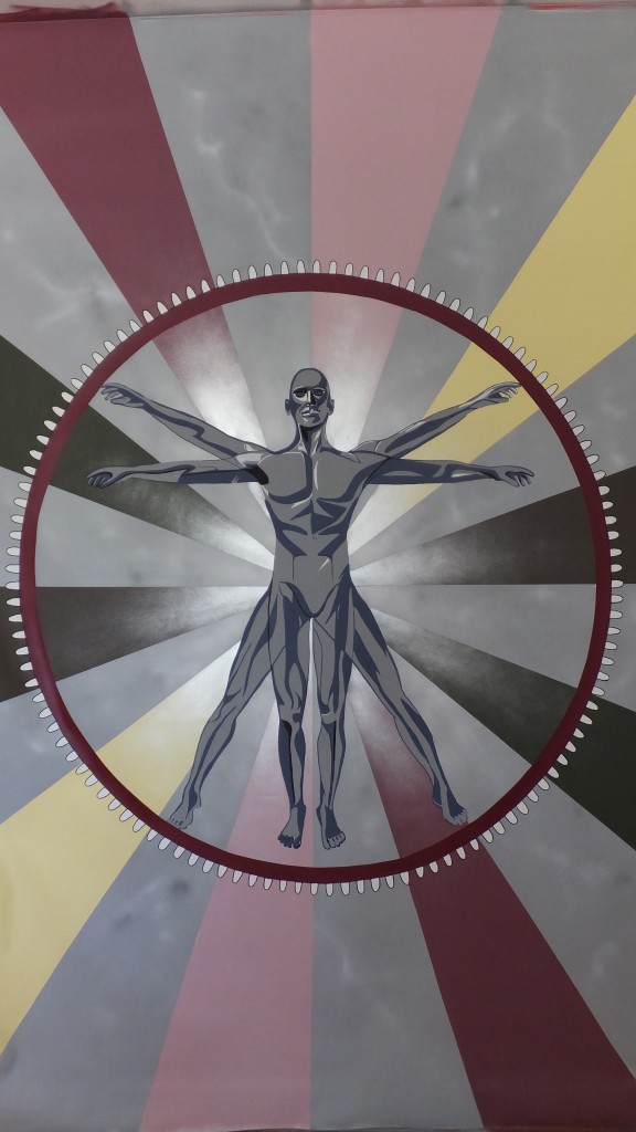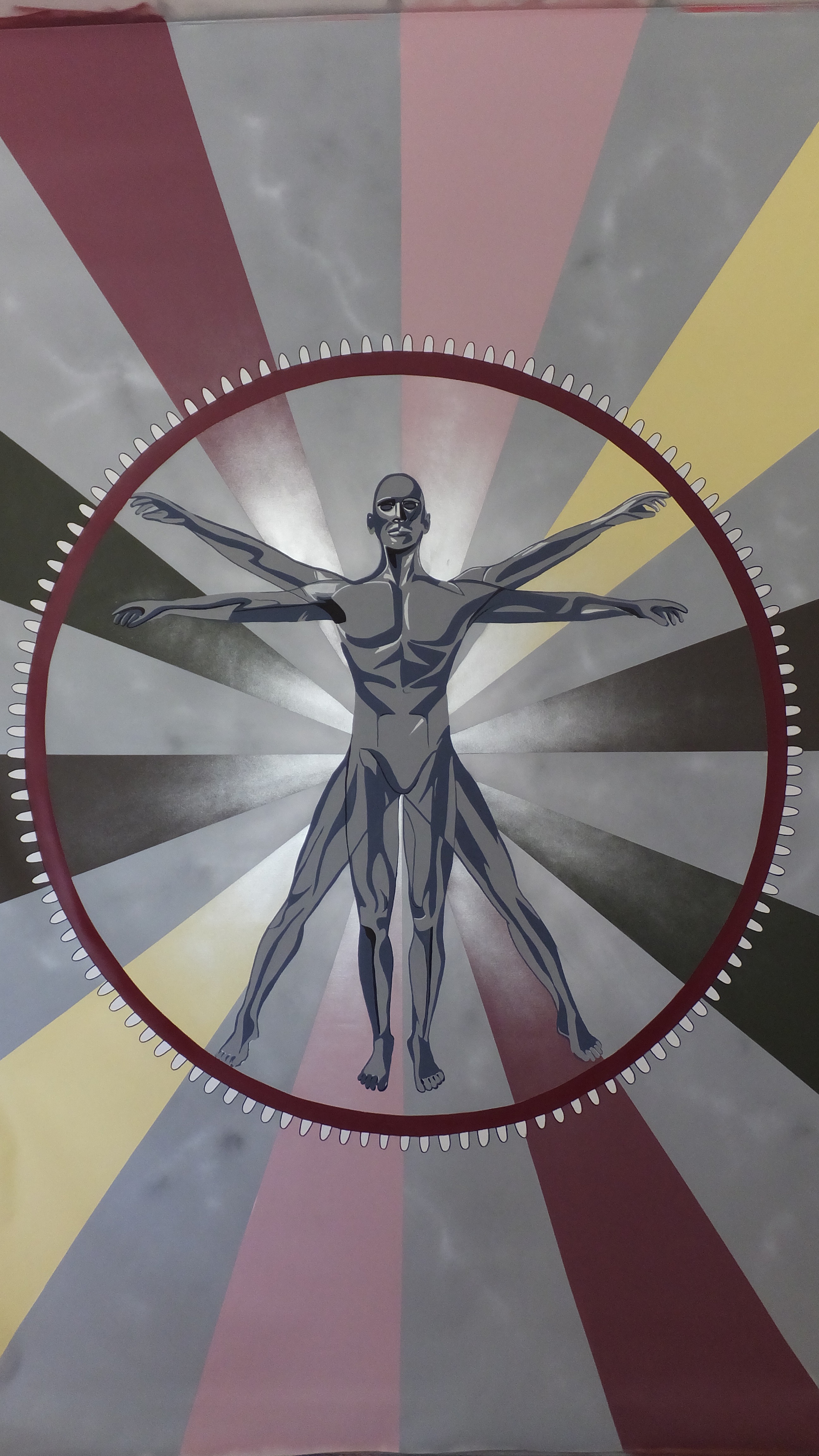 Description de l'oeuvre Peinture à l'aérosol représentant une version contemporaine de l'homme de Vetruve d'après Léonard de Vinci.